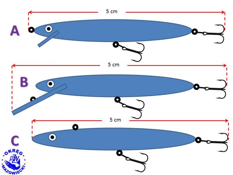 - Woblery: długość przynęty mierzymy od oczka do mocowania agrafki/żyłki do końca kotwiczki/haczyka – ryc A. W przypadku woblerów z oczkiem do mocowania agrafki/żyłki umieszczonym na sterze (tzw. woblery SDR) długość mierzymy od końca steru – ryc. B. W przypadku woblerów z mocowaniem wertykalnym (tzw. woblery typu rattlin), cykad lub wirujących ogonków długość przynęty mierzymy od początku korpusu do końca oczka do mocowania kotwiczki/haczyka lub końca paletki (tzw. wirujące ogonki) ryc. C.